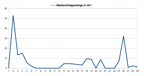 Die Grafik zeigt die Tagesregenmengen an unserer Wetterstation in Bonn. Mit ca. 180 l/m² lag die monatliche Gesamtniederschlagssumme in diesem deutlich über dem langjährigen Mittel. Im Zeitraum 2007 bis 2015 fielen im Juni durchschnittlich 94,7 l/m²: