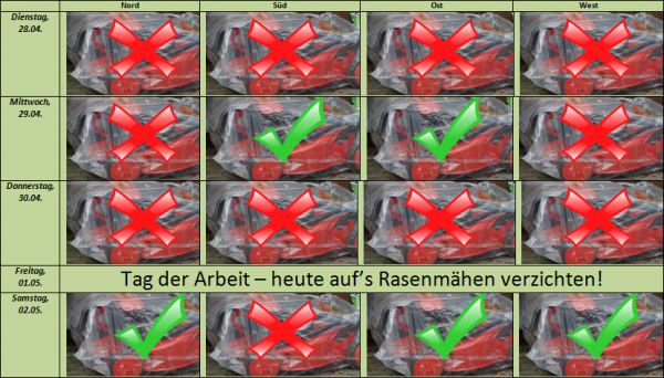 Kurz ist die Rasenmäh-Woche aufgrund der Feiertags sowieso schon. Mit Blick auf das Wetter muss der ambitionierte (Hobby-)gärtner in dieser Woche aber noch mehr arbeitsfreie Tage einplanen.