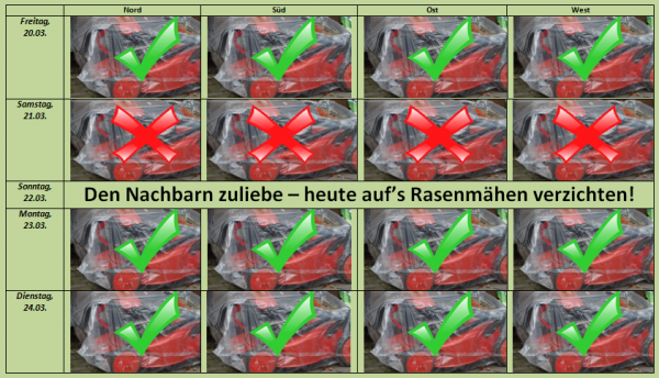 Besser schaut es da schon in der neuen Woche aus. Zumindest in der ersten Wochenhälfte, vor allem am Montag, ist eine stressfreie Rasenpflege möglich.