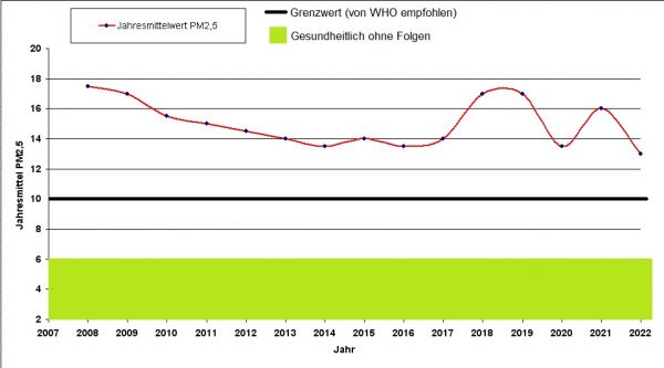 Die Coronajahre 2020 und 2021 beendeten den Aufwärtstrend aufgrund der Lockdowns, dem Trend hin zu Homeoffice und den ausgebliebenen Silvesterfeuerwerken zwar - letztere spielen bei der Jahresgesamtbilanz übrigens eine erhebliche Rolle und tragen einige Prozent zum gesamten jährlichen Feinstaubausstoß bei. Vor allem im letzten Jahr fällt auf, dass trotz der genannten Umstände der Jahresmittelwert dennoch viel zu hoch war - und sich, wie in allen Vorjahren, über dem WHO-Grenzwert von 10 µg/m³ bewegt.