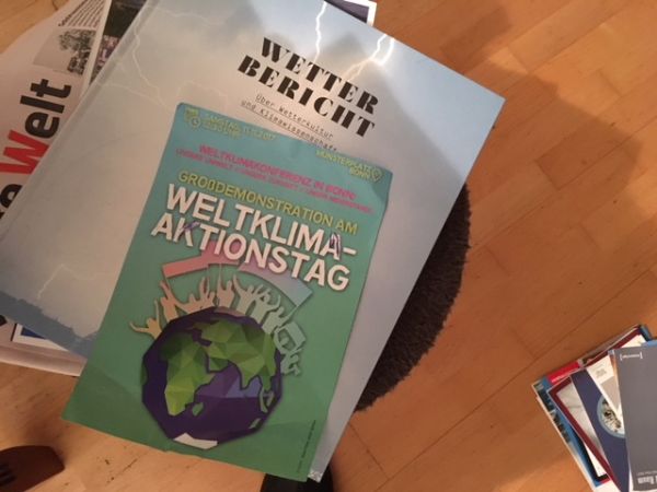 Die Einladung zur Demonstration, haben wir heute morgen in unserem Briefkasten entdeckt. Da nur wenige Kilometer entfernt von Europas größter CO2-Quelle, dem Braunkohlerevier im Rheinland die Konferenz stattfindet, werden zahlreiche Demonstranten für eine gerechte Klimapolitik kämpfen.