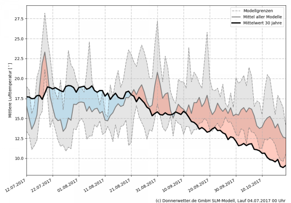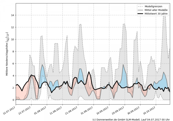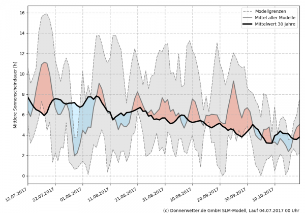 Vor allem bei Niederschlag und Sonnenstunden berechnen unsere Langfristprognosen seit Wochen den selben Trend. Wie bereits in den vergangenen Wochen und Monaten deutet sich auch für den Restsommer 2017 überdurchschnittlich sonniges Wetter an. Die Niederschlagsmengen liegen vor allem in diesem Monat deutlich unter dem langjährigen Mittel. Die mittleren Lufttemperaturen liegen zeitweise über dem Durchschnitt.