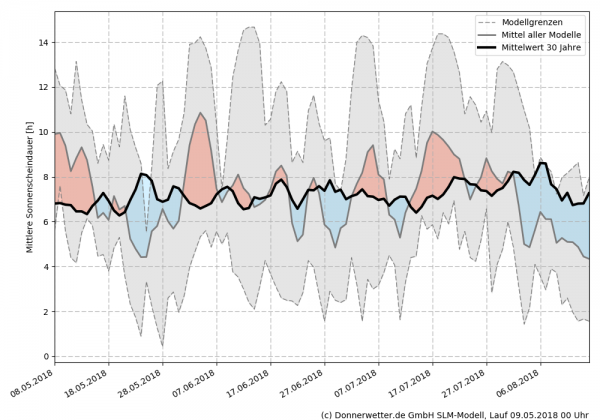 Unsere aktuellen Langfristprognosen für Lufttemperatur, Sonnenscheindauer und Niederschlagshöhe.