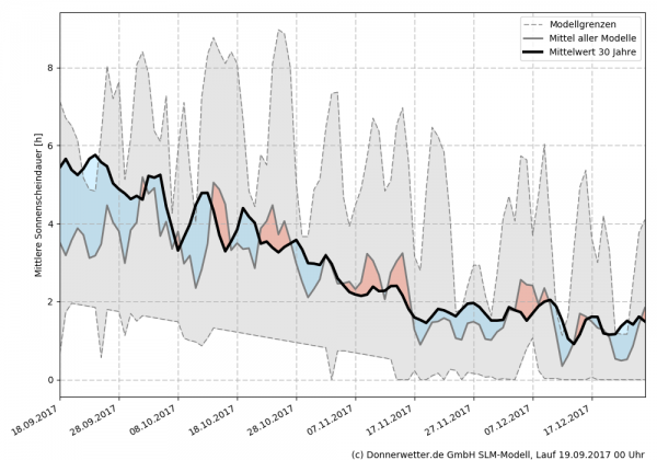 Unsere aktuellen Langfristprognosen für Lufttemperatur, Sonnenscheindauer und Niederschlagshöhe.