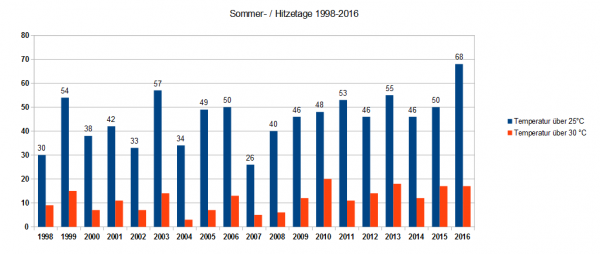 Die Grafik zeigt die Häufigkeit von Sommer- und Hitzetagen im Zeitraum 1998 bis 2016 an unserer Wetterstation in Bonn: