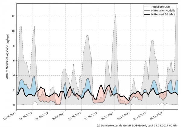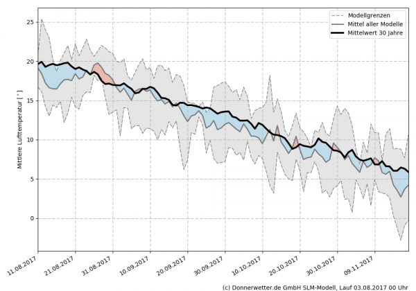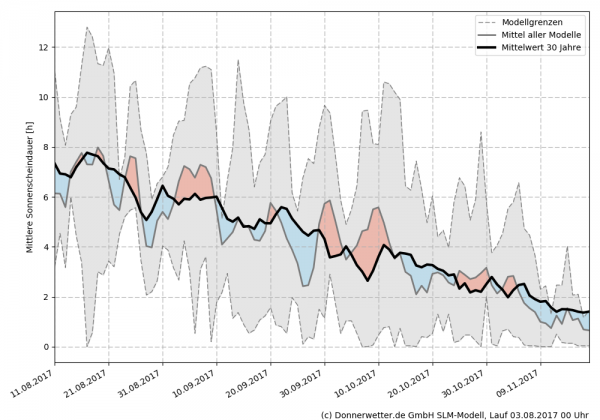 Sowohl was die Niederschlagssummen als auch die Sonnenstunden betrifft, hat der Westen in den nächsten Wochen und Monaten ein stetiges Auf und Ab zu erwarten. Etwas einiger sind sich die Modelle bei den mittleren Lufttemperaturen - hier sieht aktuell alles nach einem insgesamt leicht zu kühlen Spätsommer und Frühherbst aus.