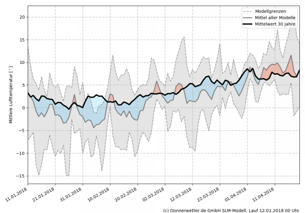 Auf ein rasches Frühlingserwachen braucht der Süden, angesichts des aktuellen Temperaturmodells, wohl erst einmal nicht hoffen. In den nächsten Wochen liegen die zu erwartenden mittleren Lufttemperaturen unter den langjährigen Mittelwerten. Weniger eindeutig ist der Trend aktuell bei Niederschlagsmenge und Sonnenscheindauer - zu trockene / nass und sonnige bzw. sonnenarme Wetterphasen gibt es im stetigen Wechsel.