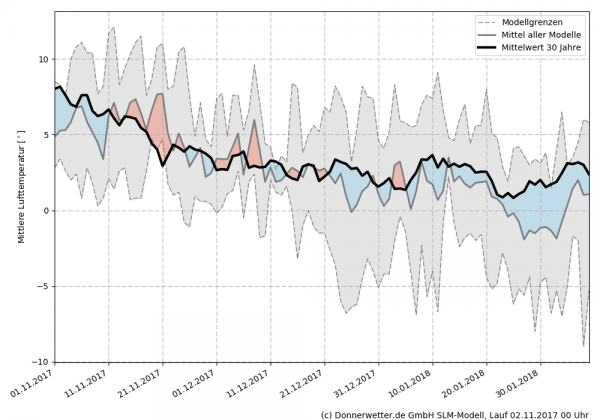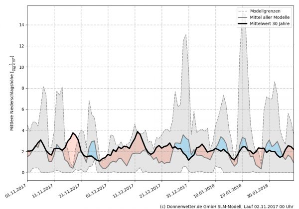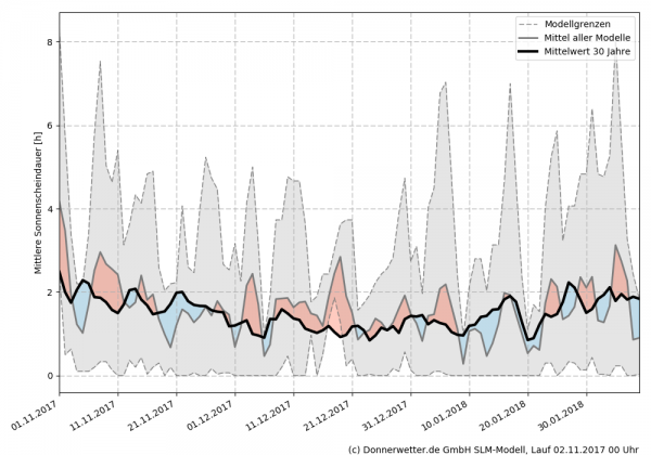 Im Norden wird es im November größtenteils durchschnittlich um die 6 °C, was bedeutet, dass die erste Monatshälfte etwas kälter und die zweite Monatshälfte etwas wärmer wird als gewohnt. In den letzten paar Tagen Richtung Dezember gibt es dann einen kleinen Temperatursturz auf nunmehr 2-3 °C. Der Niederschlagsdurchschnitt liegt durchweg unter der Normalkurve, was einen eher trockenen November bedeutet. Nur um den 25.11. gibt es einen kleinen Peak, der viel Niederschlag verspricht. Gerade auch aufgrund der eher niedrigen Temperaturen kann es sein, dass der Niederschlag an diesen Tagen zum ersten Mal diesen Herbst/Winter den Boden als Schnee erreicht. Die Sonnenscheindauer liegt diesen Monat bei durchschnittlichen zwei Stunden pro Tag.
