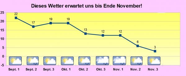 Nach einer eher verregneten zweiten Oktoberhälfte, deuten die Prognosen dann einen deutlichen Temperatursturz im November an. Vor allem die letzten beiden Novemberdekaden fallen bei meist trockener Witterung deutlich zu kühl aus.