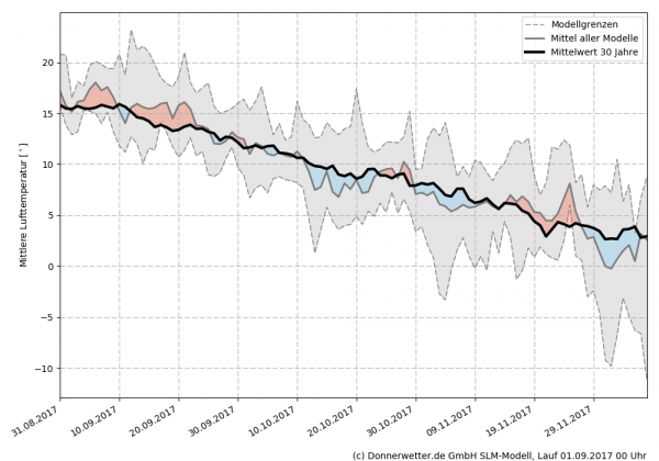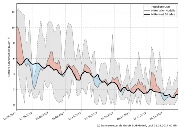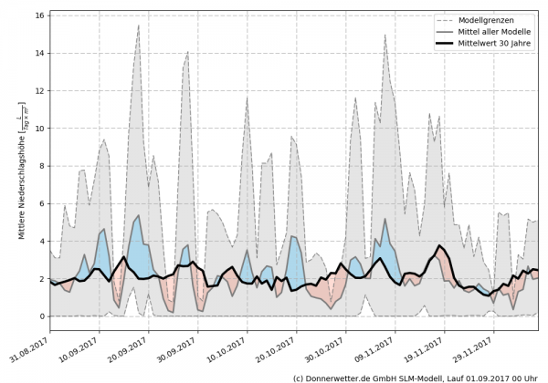 Im Gegensatz zu anderen Landesteilen kann der Norden in den nächsten Wochen phasenweise mit den zu erwartenden Lufttemperaturen sowie der Sonnenscheindauer punkten. Sich allzu früh einnistendes Herbstwetter ist nach aktuellem Stand der Modellrechnungen eher unwahrscheinlich. Dennoch gibt es auch immer wieder nasse Phasen, wie die zweiten Grafik veranschaulicht.