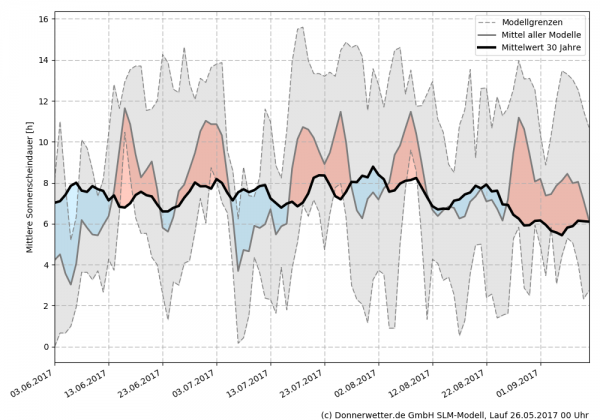 Nach einem zu kühlen Sommer berechnen unsere aktuellen Modelle zur Zeit einen deutlichen Temperaturanstieg ab Ende August. Weiterhin ist der Sommer insgesamt durch häufig Trockenphasen und überdurchschnittlich viele Sonnenstunden geprägt.