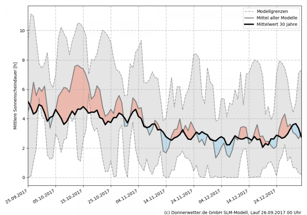 Insgesamt unterdurchschnittlich temperiert berechnet das aktuelle Langfristmodell die kommenden Wochen im Süden. Doch damit nicht genug: Auch die zu erwartenden Niederschlagsmengen dürften Freunde des goldenen Herbstes nur wenig erfreuen. Anders sieht es da aber mit dem Blick auf die dritte und letzte Grafik aus: Bei den Sonnenstunden kann die Südhälfte des Landes dann nämlich doch noch punkten. Vor allem bis Anfang November sind viel sonnige Abschnitte zu erwarten.