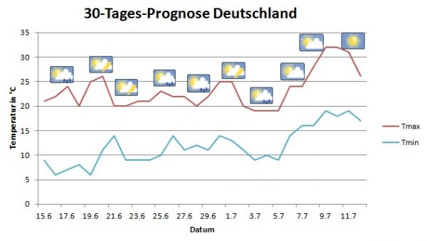 Nach derzeitigem Stand rechnen wir mit einer Wahrscheinlichkeit um 60% mit einem zwar überdurchschnittlich warmen, dafür aber eher wechselhaften Sommer: