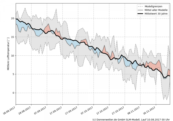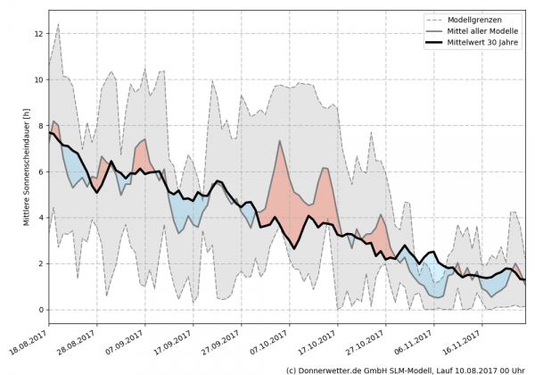 Für den Westen berechnet unser aktuelles Modell die nächsten Wochen tatsächlich als tendenziell zu sonnenarm. Eine längere Phase mit überdurchschnittlich vielen Sonnenstunden kündigt sich erst wieder Anfang Oktober an. Relativ unspektakülar verhält es sich mit den zu erwartenden Tagesmitteltemperaturen, meist liegen sie leicht unter dem langjährigen Mittel.