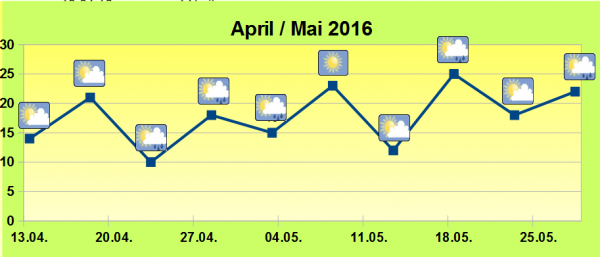 Der Wonnemonat Mai zeichnet sich dann durch einen Wechsel von Regen- und sonnigen Phasen aus. Die Temperaturen liegt leicht über dem langjährigen Mittelwert.
