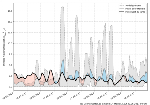 Auch im Osten geht es zwar eher wechselhaft in den neuen Monat, Regenmengen wie am Donnerstag und Freitag sind aber vorerst nicht mehr zu erwarten. Stattdessen bleibt es im neuen Monat über weite Strecken bei eher gemäßigten Julitemperaturen, eine Trendwende deutet sich nach wie vor erst im August an. Welche Abweichungen unsere Modelle in Hinblick auf Temperatur, Niederschlag und Sonnenscheindauer sehen, zeigen die nachfolgenden Grafiken.