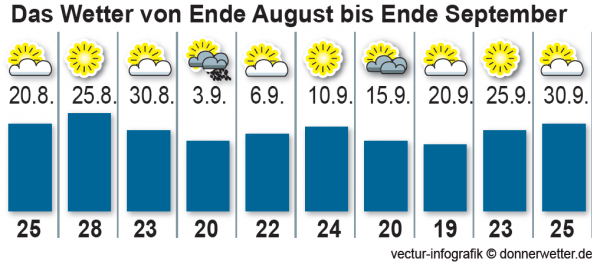 Für die kommenden Wochen berechnen unsere Langfristmodelle ebenfalls warmes (Spät-)sommerwetter - vor allem der September deutet sich als deutlich zu warm und zu trocken an.