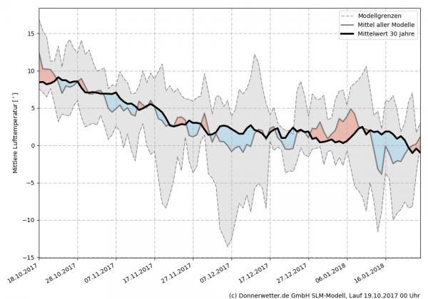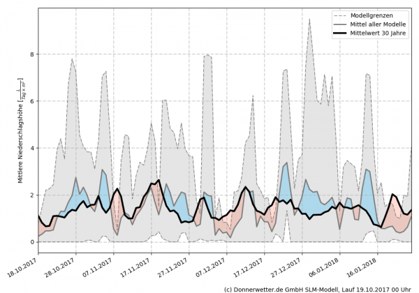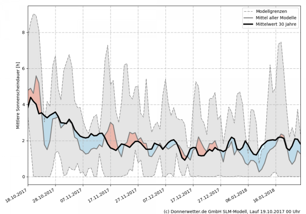 Als eher unauffällig berechnen die aktuellen Modelle zur Zeit den Verlauf der mittleren Lufttemperaturen im Osten des Landes. Und auch die zu erwartenden Niederschlagssummen bewegen sich in den kommenden Wochen mal über, mal unter dem langjährigen Mittel. Bei der Sonnenscheindauer sieht es vor allem zwischen dem 25.10. und dem 20.11. eher mau aus.