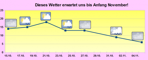 Vom Temperaturniveau bewegen wir uns in den letzten beiden Oktoberwochen meist unter der 20-Grad-Marke; trotzdem meldet sich auch häufig die Sonne zu Wort. Unterm Strich dürfte dieser Monat als leicht zu milder bzw. durchschnittlich temperierter Oktober abschließen.