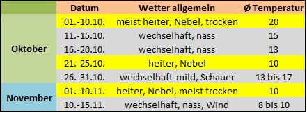 Schöne Phasen mit zeitweiligem Nebel und wechselhaft Phasen, die örtlich auch mal starken Wind bringen können, wechseln sich nach jetzigen Modellberechnungen im Oktober und November immer wieder ab.