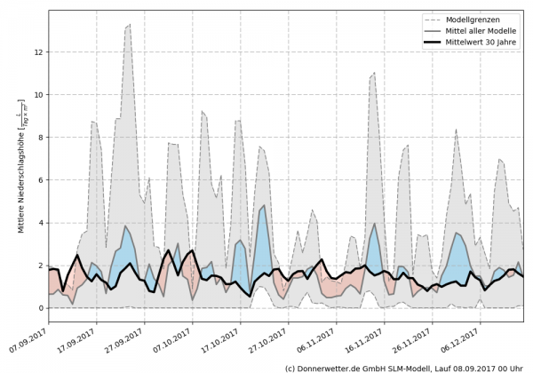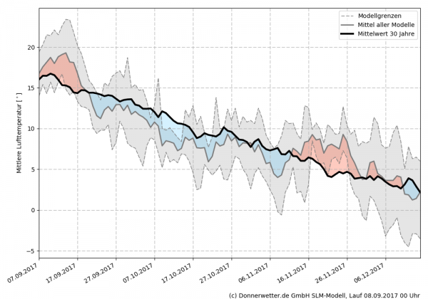 Von den kommenden Tagen einmal abgesehen, droht dem Westen laut aktueller Modelle ab der zweiten Septemberhälfte erst mal eine Temperatur-Durststrecke. Erst Anfang November liegen die mittleren Lufttemperturen wieder dauerhafter über dem 30-Jahres-Mittel. Bei Niederschlag ist der Trend weniger eindeutig, mal liegen die Werte über, mal unter dem Durchschnitt. Für die Sonnenstunden sieht es in diesem Herbst dagegen wieder eher schlecht aus...