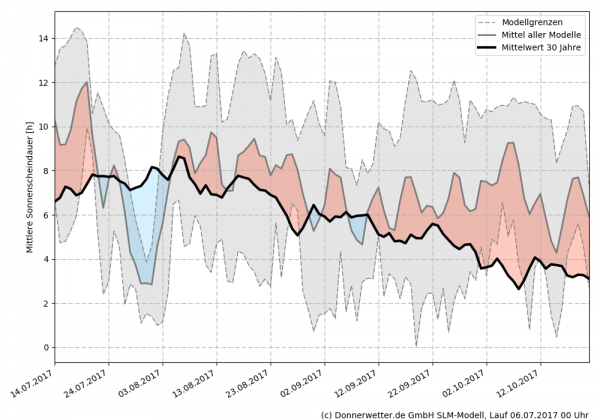 Der Niederschlagstrend für den Westen bleibt für die kommenden Wochen eher unspektulär - zeitweise liegen die zu erwartenden Niederschlagssummen über, zeitweise unter den langjährigen Mittelwerten. Etwas anders verhält es sich da mit der Temperatur und der Sonnenscheindauer.Vor allem zwischen der dritten Juli- und der zweiten Augustdekade liegen die mittleren Lufttemperaturen häufig unter dem Durchschnitt, danach kündigen sich aber viele warme Spätsommertage an. Zudem darf sich der Westen über viele Sonnenstunden freuen.