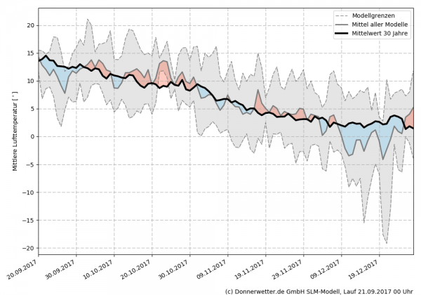 Relativ unspektakülar, Temperaturen und Niederschlagsmengen betreffend, geht der Süden des Landes die neue Jahreszeit an. Vor allem im neuen Monat liegen die mittleren Lufttemperaturen tendenziell etwas über dem Durchschnitt. Grund zur Freude dürfte aber vor allem der Blick auf die dritte Grafik auslösen: Nach aktuellem Stand der Berechungen begleiten uns über weite Teile des Oktobers viele sonnige Phasen.