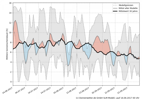 Anders als die Niederschlagsmengen stechen die Abweichungen bei den Mitteltemperaturen in den kommenden Wochen deutlich hervor. Sie liegen zwischen Anfang Juli und Mitte August teils deutlich unter den langjährigen Mittelwerten. Die Sonnenscheindauer legt, wie in der letzten Grafik zu erkennen, eine Berg- und Talfahrt nach der anderen hin.