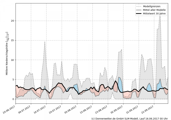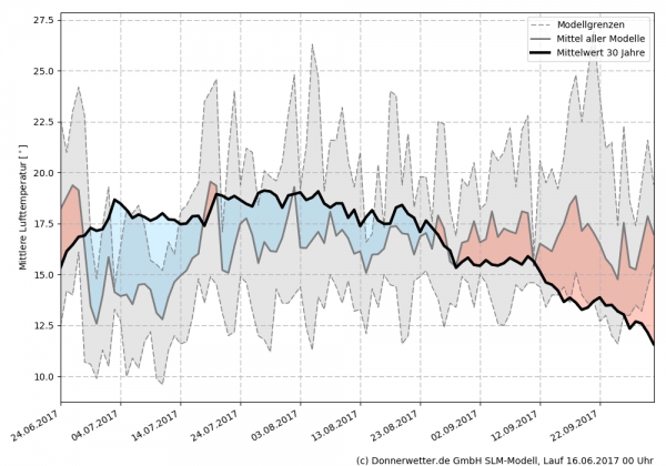 Die aktuellen Modellrechnungen weisen die Mitteltemperaturen im Juli und August über weite Strecken als unterdurschnittlich aus. Ebenfalls unter den langjährigen Mittelwerten liegen die zu erwartenden Niederschlagsmengen. Erfreuliches gibt es dagegen von der Sonnenscheindauer zu berichten: Sie liegt vor allem im Restjuni sowie ab Ende August teils deutlich über dem Mittel.