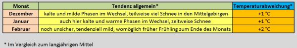 Durchschnittlich wechselhaft und tendenziell leicht zu mild deuten sich dann die kommenden drei Wintermonate an. Milde Phasen wechseln sich im Januar und Februar mit kalten Phasen ab, immer wieder kann auch mal Schnee dabei sein.