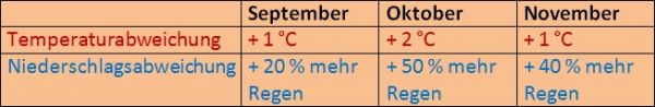 Besonders der Oktober und November könnten daher auch 2014 deutlich zu feucht und zu warm werden. In diesem Herbst beträgt die durchschnittliche Temperaturabweichung um +1 bis +2 Grad C: