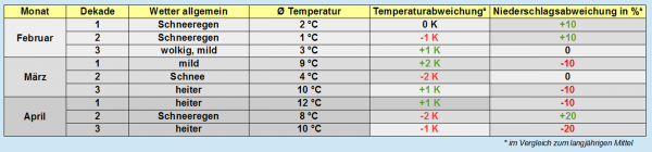 Weiterhin erwarten wird einen eher späten Frühling und nasskaltes Wetter bis weit in den März.