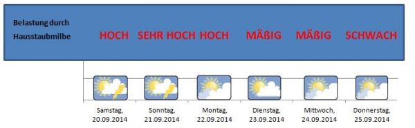 Wir müssen mit erheblichem Hausstaubmilbenallergiepotential rechnen. Erst im Laufe der neuen Woche reduziert sich die Belastung.