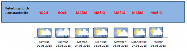 Das feuchtwarme Wetter sorgt derzeit im Haus für ein hohes Allergiepotential. Besonders am Sonntag bestehen durch den Durchzug eines Regengebietes hohe Belastungen durch Hausstaubmilben.