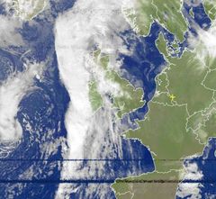 Satellitenbild: Dunkle Wolken zwischen Spanien und Schottland