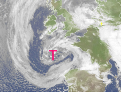 Klassischer Wolkenwirbel über der Biskaya