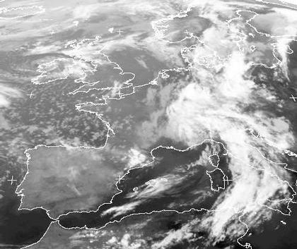 An der Gewitterfront von Tief 'Ingo' mit Zentrum bei Irland hat sich über Norditalien ein kleines aber kräftiges Randtief gebildet, das örtlich für kräftigen Gewitterrgen sorgt. Seine hochreichenden Cirruswolken über der Gewitterfront sind deutlich markanter als der unscheinbare Wirbel des steuernden Tiefs, das sich allmählich abschwächt.