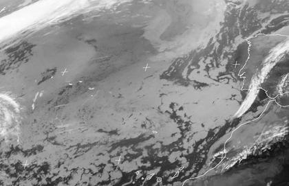 Dass Hochdruckwetter nicht immer mit viel Sonnenschein gleichzusetzen ist, sieht man schön an diesem Bild vom Atlantik. Die Inselgruppe der Azoren rechts im Bild liegt unter relativ starkem Einfluss des gleichnamigen Hochdruckgebiets. In niedrigen Luftschichten hat sich jedoch kühle und feuchte Luft ausgebreitet, deren Wolken in den unter Hochdruckeinfluss immer mehr zu einer gleichmäßig grauen Wolkendecke zusammen geschoben werden. Nur auf den Südseiten der Inseln, im Windschatten der Berge, gibt es Chancen auf etwas mehr Sonnenschein.