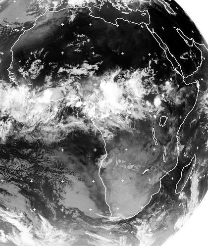 Weite Teile des afrikanischen Kontinents weisen keine Bewölkung auf. Lediglich in seiner Mitte, meist nördlich des Äquators erkennt man die Bewölkung von tropischen Schauern und Gewittern. Im Süden, im Norden und auch an der Küste des Indischen Ozeans ist es dagegen gering bewölkt und trocken. (Bildquelle: NERC Satellite Receiving Station, Dundee University, Scotland, http://www.sat.dundee.ac.uk/)