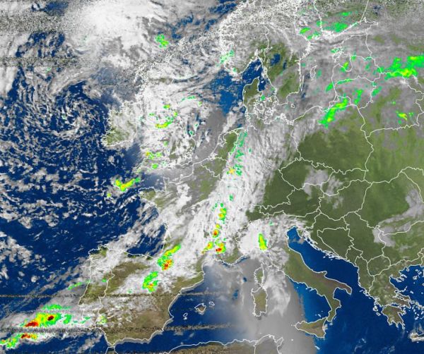 Auf dem Satellitenbild von heute Nachmittag erkennen wir ein langgestrecktes Wolkenband, das sich von der Iberischen Halbinsel, über Frankreich, Deutschland bis hin zur Ostsee erstreckt. Unter diesen dichten Wolken fiel verbreitet Regen. Vor allem über der Iberischen Halbinsel, aber auch über Frankreich entluden sich gebietsweise auch Gewitter.