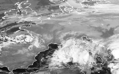 Eine dichte Wolkendecke breitet sich von den Balearen über Korsika und Sardinien bis nach Italien aus. Die hohen, und daher weißen Wolken deuten auf zum Teil kräftige Schauer hin, die heute im Laufe des Tages über Italien hinwegziehen werden. Über Deutschland liegt ebenfalls eine Wolkendecke, die vor allem in den Mittelgebirgen für Schneefall sorgt.