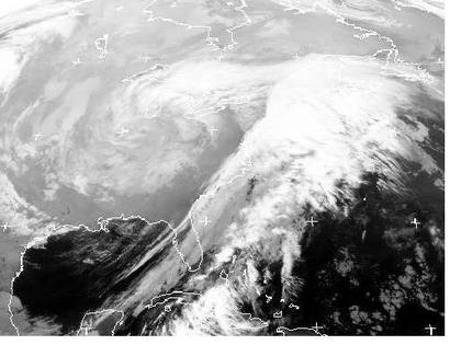 Über dem Osten der USA ist auf dem Satellitenbild von Montag früh ein dichtes Wolkenband zu erkennen. Es gehört zu einem kräftigen Tief über den großen Seen, dessen Fronten sich bis an die Ostküste ausgebreitet haben. Hier kommt es heute häufig zu Regen, teils auch zu Schnee. (Bildquelle: NERC Satellite Receiving Station, Dundee University, Scotland, http://www.sat.dundee.ac.uk/)