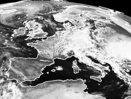 Von Südosteuropa her liegt auch Deutschland weiter unter leichtem Tiefdruckeinfluss. Die dichtesten Wolken findet man dabei eher richtig Ostdeutschland. Hier liegt eine Luftmassengrenze zu etwas milderer Luft weiter im Osten. Nach Nordwesten hin ist der Tiefdruckeinfluss etwas geringer. In der von Norden eingeströmten feucht-kühlen Luft bilden sich aber viele Schauerwolken. (Bildquelle: NERC Satellite Receiving Station, Dundee University, Scotland, http://www.sat.dundee.ac.uk/)