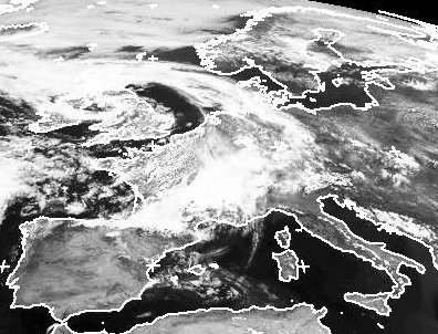 Die Kaltfront von Tief 'Amelie' über den Britischen Inseln erstreckt sich auf dem Satellitenbild vom Freitagmittag mit ihren Wolken in einem Bogen von der Nordsee bis zum Alpenraum. Dabei kam es in ihrem Bereich über Deutschland zu teils kräftigen Regenfällen und Gewittern. Auf der Rückseite der Kaltfront,über England und Nordwestfrankreich, ziehen einige lockere Quellwolken durch, die aber nur örtlich Schauer brachten.