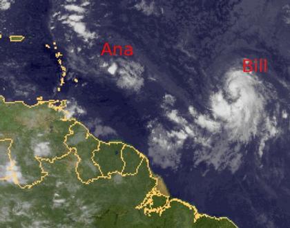 'Bill' liegt noch weiter östlich auf dem Atlantik, zieht jedoch ebenfalls nach Westen. 'Bill' erreicht bereits Spitzenböen um 110 km/h und zeichnet sich schon deutlicher im Satellitenbild ab. Mit einer weiteren Verstärkung zum Hurrikan ist zu rechnen. Er nähert sich jedoch erst Mitte der Woche den Antillen.