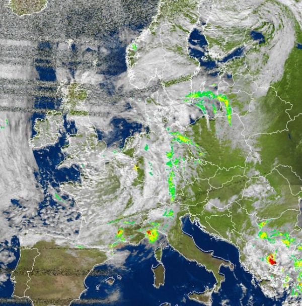 Auf dem Satellitenfoto von heute Nachmittag sind über weiten Teilen von West-, Nordwest- und Nordeuropa viele und verbreitet auch kompakte Wolken zu erkennen. Hierbei sorgen Tiefdruckgebiete über der Nordsee und über dem Ärmelkanal mit ihren Ausläufern für sehr unbeständiges, verbreitet kühles und von teils kräftigen Schauern durchsetztes Wetter.