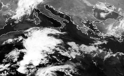 Der Ausschnitt zeigt die Gewitterzone über Algerien und Libyen sowie die Wolken entlang der schwachen Kaltfront über dem östlichen Mittelmeer. Ein Hoch über dem Balkan drückt kühlere Festlandsluft nach Süden und somit über das relativ warme Mittelmeerwasser, so daß sich im Bereich der kühleren Luft Quellwolken bilden.