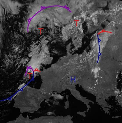 Hoch 'Fee' über den Alpen und Süddeutschland bringt verbreitet sonniges Wetter in Mitteleuropa, auch am Mittelmeer ist es fast überall wolkenlos. Im Norden liegen dagegen die Wolken von Tief 'Tommy' im Nordosten die Wolken von Tief 'Uwe'. Über der Biskaya baut sich ein neues Tief namens 'Volkrat' auf. Seine Ausläufer erreichen bereits morgen Deutschland und sorgen für teils kräftige Gewitter.