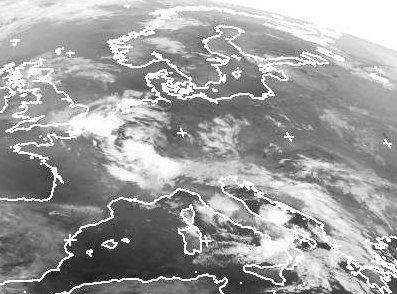 Das Satellitenbild der Nacht zeigt über Europa allgemein nur wenig Bewölkung. Mehr Wolken finden sich zwischen der Nordseeküste und der Schweiz sowie über Italien und dem Adriaraum. In diesen Bereichen sorgt etwas tieferer Luftdruck und feuchtere Luft für Gewitter. Die meisten der Wolken, die dabei über Deutschland liegen, sind jedoch nur die Reste der gestrigen Gewitter. Sie sind heute kaum von Bedeutung. Auch neue Gewitter bilden sich kaum, am ehesten aber im Westen und Südwesten. (Bildquelle: NERC Satellite Receiving Station, Dundee University, Scotland, http://www.sat.dundee.ac.uk/)