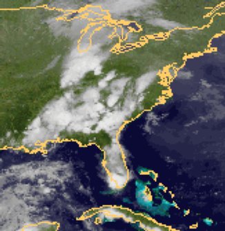 In feucht-warmer Luft haben sich über dem Südosten der USA einige Gewitterzellen gebildet. Sie erstrecken sich bis zum südliche Michigansee. Sonst liegt über den Großen Seen die Bewölkung eines Tiefdruckgebietes. Weiter im Westen, aber auch im Nordosten der USA findet man unter Hochdruckeinfluss nur wenige Wolken.